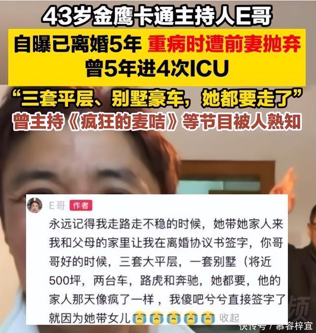 近日,一位知名少儿主持人的近照刷爆全网。 曾经阳光健壮的他,如今暴瘦脱相,颧骨凸起、两腮凹陷,熟悉他的观众都认不出。 谁能想到,这五年里,他先后4次被送进ICU,与死神博弈。 随着更多内幕曝出,更让人寒心的是他前妻的所作所为…… 相信很多80后、90后对他都有印象,小时候放学回家,守在电视机前看少儿节目,E哥就是那个最讨喜的主持人。 他不摆架子,说话接地气,跟小朋友互动时温柔又有耐心,不管是做游戏还是念儿歌,都格外投入。 那时候我们都觉得,这个主持人肯定一辈子都这么阳光,生活顺风顺水,没什么烦心事。 可谁能想到,镜头之外的他,藏着一段长达五年的煎熬时光,甚至差点没熬过来。 说出来你们可能都不敢信,短短五年时间,他竟然先后4次被送进ICU抢救,每一次都是与死神擦肩而过。 他没细说具体得的是什么病,只偶尔晒过自己吃的药,看得出来是需要长期调理、时刻注意的重症,大概率和静脉血栓、肺部问题有关。 想想就心疼,当年那个能轻松扛着道具跑上跑下、录制节目一整天都不喊累的人,后来连正常走路都要小心翼翼,稍微动一动就气喘吁吁,甚至连站稳都成了难题。 最严重的时候,他躺在ICU里,浑身插满管子,意识模糊,连自己的亲人都快认不清,身边只有年迈的父母守着,那种无助和绝望,估计只有经历过的人才能懂。 更让人寒心的是,在他最虚弱、最需要人陪伴的时候,陪在他身边的不是相守多年的前妻,反而等来的是对方的“釜底抽薪”。 那段时间,他刚从ICU抢救回来,身体还没来得及恢复,连说话的力气都没有,前妻就带着家人找上门来,一开口不是关心他的身体,而是谈离婚、分财产。 要知道,E哥当年在事业巅峰期,攒下了不少家产,三套大平层,一套近五百平米的别墅,还有两台豪车,都是他辛辛苦苦打拼来的。 可那时候的他,满心都是赶紧好起来,不想因为财产纠纷影响到孩子,更没有多余的精力去争执。 于是为了让孩子能有一个稳定的成长环境,他咬着牙,答应了前妻所有的要求,在离婚协议上签了字。 就这么着,他大半辈子的心血,几乎被分走一空,三套大平层、别墅还有豪车,全归了前妻,就连女儿的抚养权,也交给了对方。 更让人唏嘘的是,从他病重住院,到签字离婚,前妻和她的家人,从来没有去医院探望过他一次,没有问过一句他的身体状况,眼里只有那些房产和车子,仿佛他们之间从来没有过夫妻情分,仿佛他只是一个可以随意拿捏的陌生人。 换做是谁,遭遇这样的打击,估计都很难扛过来。 一边是身体的剧痛,反复被病痛折磨,多次游走在生死边缘;一边是爱人的背叛配资114门户网,在自己最脆弱的时候被釜底抽薪,连最后一点温暖都被剥夺。 那段时间,E哥坦言,自己甚至有过放弃的念头,觉得活着太煎熬了,既要承受身体的痛苦,还要消化心里的委屈和绝望。 但他没有真的倒下,看着年迈的父母,想着年幼的女儿,他告诉自己,必须撑下去。 出院之后,他开始安心调理身体,按时吃药、定期复查,每天坚持锻炼,哪怕只是慢走几步,也从来没有放弃过。 失去了大部分财产,他的生活一下子回到了原点,再也不用为物质操心的日子一去不复返。 他开始重新规划开支,脚踏实地地做事,身体允许的时候,就去录录节目、拍些短视频,不靠过去的名气,只靠自己的努力谋生。 这几年,他很少在镜头前提起自己的委屈,也从来没有卖惨博同情。 每次出现在大家面前,都是一副温和、从容的样子,哪怕身形依旧消瘦,眼神里却多了几分坚定和释然。 直到最近,他公开了自己的新恋情,网友们追问之下,他才缓缓说出了这五年的遭遇,没有指责,没有抱怨,只是平静地讲述着那些不为人知的挣扎。 有人说,他太傻了,不该在病重的时候轻易妥协,不该把自己的心血白白拱手让人; 也有人说,前妻太绝情,夫妻本是同林鸟,大难临头各自飞,这句话在她身上体现得淋漓尽致。 但E哥却说,过去的事情已经过去了,他不想再纠结于对错,也不想再记恨谁。 比起那些身外之物,能活着,能陪伴在父母和孩子身边,能遇到一个愿意陪自己走过低谷的人,就已经很幸运了。 现在的他,依旧在慢慢恢复,虽然身形还没有回到当年的样子,脸上也多了几分沧桑,但状态已经好了很多。 他会在社交平台上分享自己的日常,晒一晒锻炼的视频,拍一拍身边的小事,偶尔也会和女儿见面,尽自己所能做一个合格的父亲。 他说,以前的自己,总是为别人活,为家庭、为孩子、为观众,现在,他想为自己活一次,珍惜眼前的幸福,好好对待自己的身体。 看着他现在的样子,真的让人又心疼又佩服。 心疼他这五年所承受的一切配资114门户网,心疼他在最脆弱的时候被最亲近的人背叛; 佩服他的坚强和释然,佩服他在遭遇重击之后,依然能笑着面对生活,依然能保持善良和温柔。 其实人生就是这样,难免会遇到突如其来的风雨,难免会遭遇意想不到的背叛。 我们可能会迷茫,会绝望,会觉得撑不下去,但只要不放弃,只要心中有光,就一定能走出低谷,迎来属于自己的晴天。 就像E哥一样,那些打不倒他的,终将让他变得更加强大。 最后,也希望E哥能早日康复,越来越好,能一直这样从容、坚定地走下去,珍惜眼前的幸福。 也希望每一个善良、坚强的人,都能被世界温柔以待,就算遭遇风雨,也能有人陪在身边,不离不弃。 毕竟,比起财富和名利,健康和真心,才是我们一生中最珍贵的东西。
